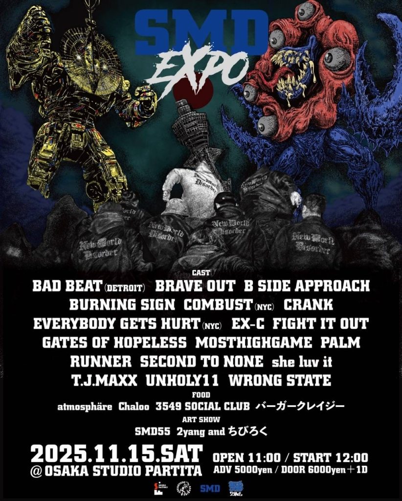 SMD Crew、そしてEGHを初めてを見たイベント、HARDCORE BREAKOUTを軸にその時に繋がった仲間や俺ら以降に繋がりが出来た若手もおったら、上下関係なく入れてfes的な感じでやろうかって。それが7年前なので、その時みんな解散してることないように毎年夏はSMD NIGHT、秋はSMD FESTっていうのを継続してやってSMD万博を迎えようっていう流れが発端です。
